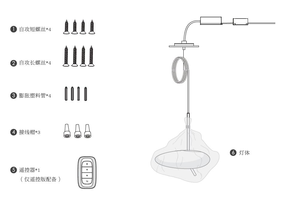 自攻短螺丝*4;自攻长螺丝*4;膨胀塑料管*4;接线帽*3 遥控器*1(遥控版本);灯体*1;